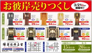 お彼岸売りつくしセール開催中! 岩佐佛喜堂では、3月21日(月)まで、お彼岸売りつくしセール開催中です。本店・勅使店では、皆さまのご来店をお待ちしています。四国新聞オアシス2月12日号の広告にある お仏具、お線香・ローソ […]