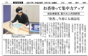 香川大学工学部との共同研究が四国新聞に掲載されました。 研究に使用した塗香は、新シリーズ「香粉(KOKO)」として、東京ギフトショー(2017年2月8~10日)で初お目見えします!